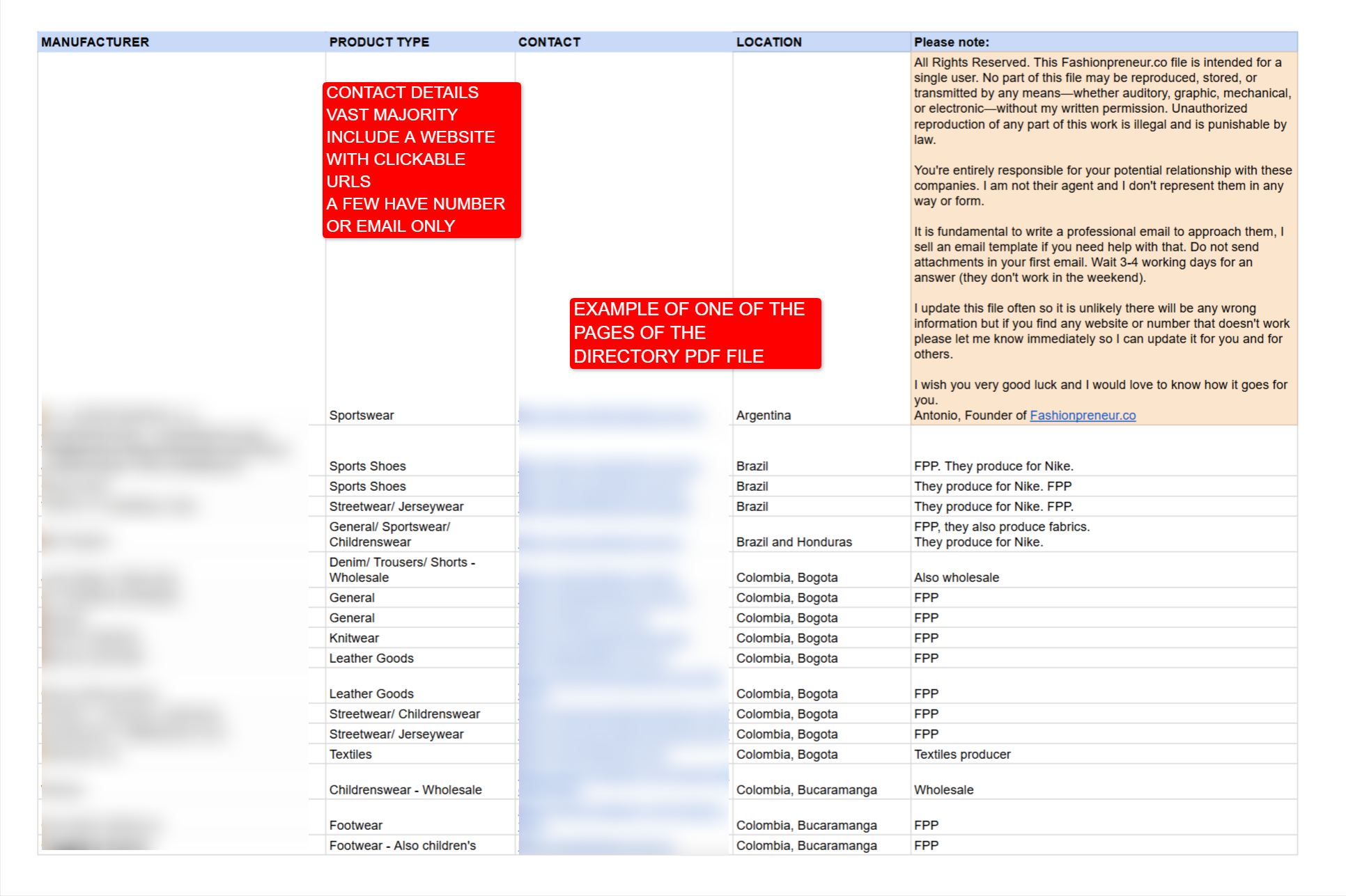Please check an example of one of the pages of the directory on the image above. You will be receiving a PDF file with clickable URLs. You can check a video as well of how the lists look like on the FAQs page.